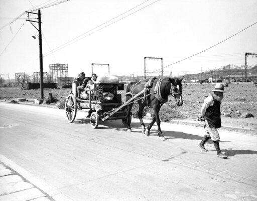 FILE - In this Oct. 11, 1945, file photo, an elderly bearded Japanese leads a horse pulling a wagon loaded with other members of the family and their household goods past the wreckage of buildings on the outskirts of Tokyo as people return to their home after having evacuated during U.S. air raids on the Japanese capital. The bombs stopped falling 75 years ago, but it is entirely possible - crucial even, some argue - to view the region's world-beating economies, its massive cultural and political reach and its bitter trade, territory and history disputes all through a single prism: Japan's aggression in the Pacific during World War II. (AP Photo/Max Desfor, File)