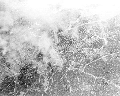 FILE - This March 10, 1945, file photo shows light sections, still smoking, several hours after a raid by more than 300 Marianas-based B-29s on Tokyo. The Imperial Palace, upper center, was undamaged, but burned up to the edge of the grounds. The bombs stopped falling 75 years ago, but it is entirely possible - crucial even, some argue - to view the region's world-beating economies, its massive cultural and political reach and its bitter trade, territory and history disputes all through a single prism: Japan's aggression in the Pacific during World War II. (AP Photo)