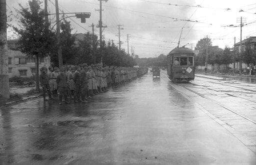 FILE - In this Aug. 31, 1945, file photo, a battalion of Japanese soldiers lines on a Tokyo street several days before American military forces officially occupy the city. The bombs stopped falling 75 years ago, but it is entirely possible - crucial even, some argue - to view the region's world-beating economies, its massive cultural and political reach and its bitter trade, territory and history disputes all through a single prism: Japan's aggression in the Pacific during World War II. (AP Photo/Frank Filan, File)