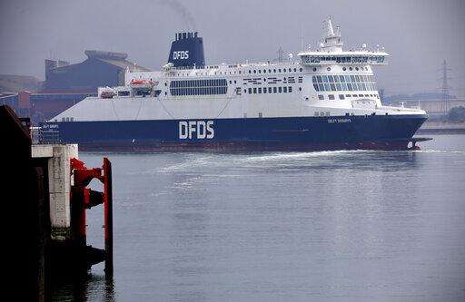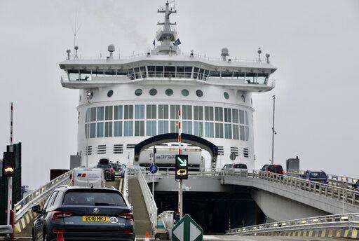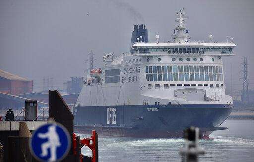 A cross-channel ferry leaves the Port of Dunkerque, France, Friday Aug.14, 2020. British holiday makers in France were mulling whether to return home early Friday to avoid having to self-isolate for 14 days following the U.K. government's decision to reimpose quarantine restrictions on France amid a recent pick-up in coronavirus infections. (AP Photo/Olivier Matthys) The Associated Press