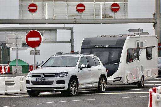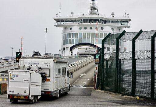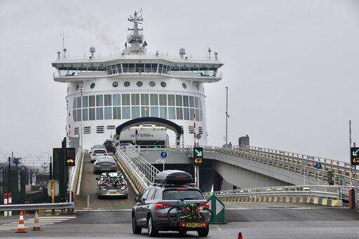 Cars are loaded onto a cross-channel ferry at the Port of Dunkerque, France, Friday Aug.14, 2020. British holiday makers in France were mulling whether to return home early Friday to avoid having to self-isolate for 14 days following the U.K. government's decision to reimpose quarantine restrictions on France amid a recent pick-up in coronavirus infections. (AP Photo/Olivier Matthys) The Associated Press