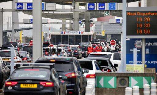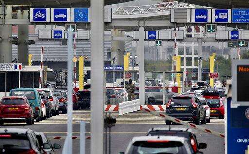 People queue in line to check-in for the Euro Tunnel train to the U.K. in Coquelles, France, Friday Aug.14, 2020. British holiday makers in France were mulling whether to return home early Friday to avoid having to self-isolate for 14 days following the U.K. government's decision to reimpose quarantine restrictions on France amid a recent pick-up in coronavirus infections. (AP Photo/Olivier Matthys) The Associated Press