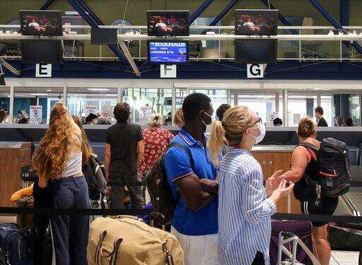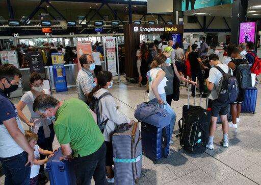 People queue to check-in at the Biarritz airport, southwestern France, Friday Aug.14, 2020. British holidaymakers in France were mulling whether to return home early Friday to avoid having to self-isolate for 14 days following the U.K. government's decision to reimpose quarantine restrictions on France amid a recent pick-up in coronavirus infections. (AP Photo/Bob Edme) The Associated Press
