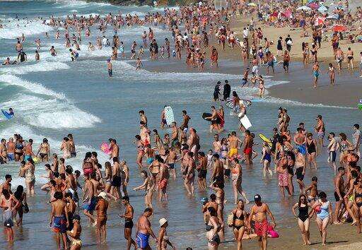 FILE - In this Saturday, Aug. 8, 2020 file photo people on the beach at Biarritz, southwestern France. The hot weather is expected to last for several days across the country. Britain will require all people arriving from France to isolate for 14 days - an announcement that throws the plans of tens of thousands of holiday makers into chaos. The government said late Thursday Aug. 13, 2020 that France is being removed from the list of nations exempted from quarantine requirements because of a rising number of coronavirus infections. (AP Photo/Bob Edme, File) The Associated Press