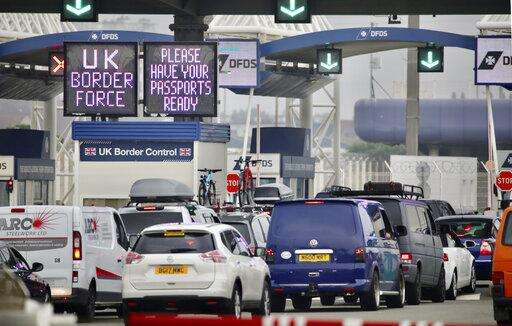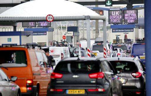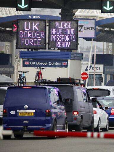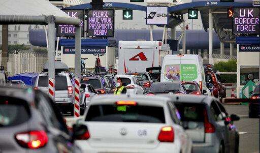 People queue in line to check-in for the cross channel ferry in Calais, France, Friday Aug.14, 2020. British holiday makers in France were mulling whether to return home early Friday to avoid having to self-isolate for 14 days following the U.K. government's decision to reimpose quarantine restrictions on France amid a recent pick-up in coronavirus infections. (AP Photo/Olivier Matthys) The Associated Press