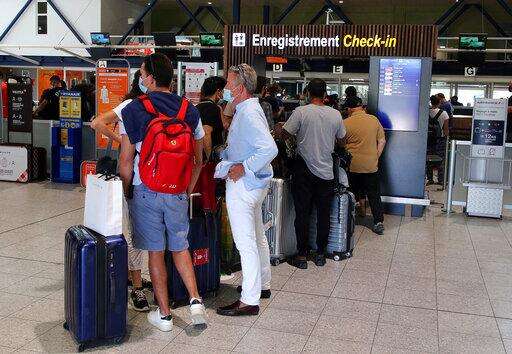 People check-in for a flight to London at the Biarritz airport, southwestern France, Friday Aug.14, 2020. British holidaymakers in France were mulling whether to return home early Friday to avoid having to self-isolate for 14 days following the U.K. government's decision to reimpose quarantine restrictions on France amid a recent pick-up in coronavirus infections. (AP Photo/Bob Edme) The Associated Press