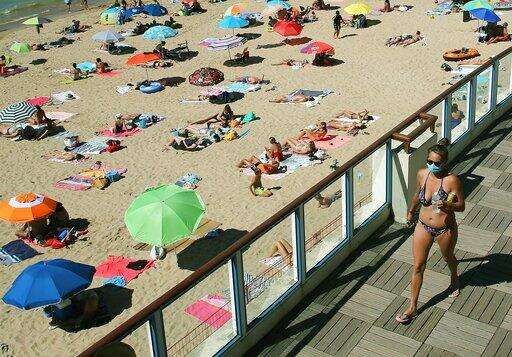 FILE - In this Wednesday, Aug. 5, 2020 file photo woman walks, wearing a face mask to protect against coronavirus, near the beach, in Saint Jean de Luz, southwestern France. Since Monday, 69 towns in western France imposed outdoor mask rules to slow the spread of coronavirus. Britain will require all people arriving from France to isolate for 14 days - an announcement that throws the plans of tens of thousands of holiday makers into chaos. The government said late Thursday Aug. 13, 2020 that France is being removed from the list of nations exempted from quarantine requirements because of a rising number of coronavirus infections. (AP Photo/Bob Edme, File) The Associated Press