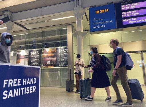 Travellers emerge from the Eurostar St Pancras International railway station, returning from France Friday Aug. 14, 2020, to avoid the quarantine restrictions. Travellers have to return to the UK before the 4.00 am Saturday deadline, to avoid new quarantine regulations imposed on people returning from France because of the coronavirus. (Kirsty O'Connor/PA via AP) The Associated Press