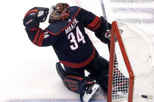 Carolina Hurricanes goaltender Petr Mrazek (34) watches as the puck goes wide of the goal during third period NHL Eastern Conference Stanley Cup playoff game in Toronto on Saturday, Aug. 15, 2020. (Chris Young/The Canadian Press via AP) The Associated Press