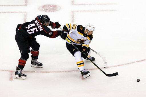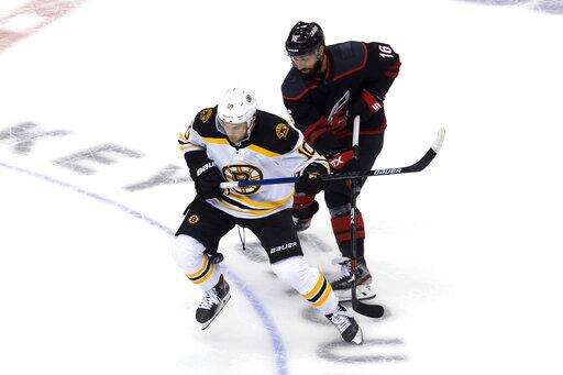 Boston Bruins' Anders Bjork (10) and Carolina Hurricanes Vincent Trocheck (16) battle for the puck during first period NHL Eastern Conference Stanley Cup playoff game in Toronto on Saturday, Aug. 15, 2020. (Chris Young/The Canadian Press via AP) The Associated Press