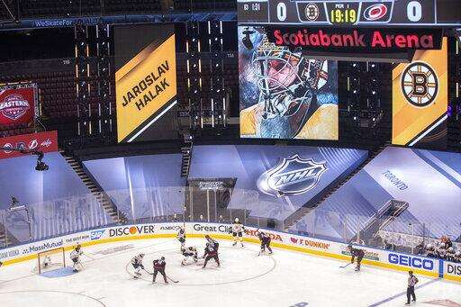 A picture of Boston Bruins goaltender Jaroslav Halak is displayed on a screen during the first period of a NHL first round Stanley Cup playoff game between the Carolina Hurricanes and Boston Bruins in Toronto, on Saturday, Aug. 15, 2020. (Chris Young/The Canadian Press via AP) The Associated Press