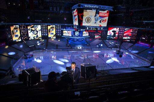 A television presenter does a pre-game report as specially constructed displays are illuminated ahead of a NHL first round Stanley Cup playoff game between the Carolina Hurricanes and Boston Bruins, in Toronto, on Saturday, Aug. 15, 2020. (Chris Young/The Canadian Press via AP) The Associated Press