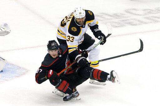Carolina Hurricanes' Andrei Svechnikov (37) is taken down by Boston Bruins' Zdeno Chara (33) during third period NHL Eastern Conference Stanley Cup playoff game in Toronto on Saturday, Aug. 15, 2020. (Chris Young/The Canadian Press via AP) The Associated Press