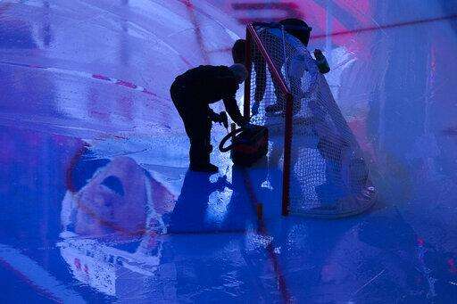 The face of a Carolina Hurricane's player shown on a specially constructed display is reflected on the ice as crew members work to install the goal posts ahead of a NHL first round Stanley Cup playoff game between the Carolina Hurricanes and Boston Bruins, in Toronto, on Saturday, Aug. 15, 2020. (Chris Young/The Canadian Press via AP) The Associated Press