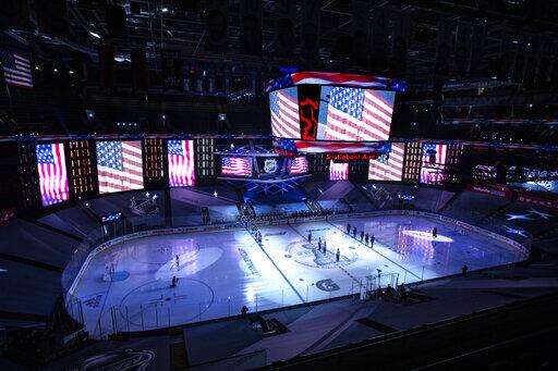The American flag is displayed on specially constructed displays during the national anthems ahead of a NHL first round Stanley Cup playoff game between the Carolina Hurricanes and Boston Bruins, in Toronto, on Saturday, Aug. 15, 2020. (Chris Young/The Canadian Press via AP) The Associated Press