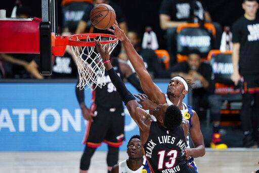 Indiana Pacers center Myles Turner (33) blocks a shot by Miami Heat forward Bam Adebayo (13) during the second half of an NBA basketball first round playoff game, Saturday, Aug. 22, 2020, in Lake Buena Vista, Fla. (AP Photo/Ashley Landis, Pool) The Associated Press