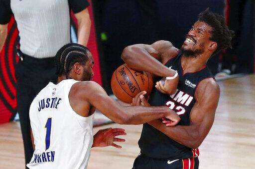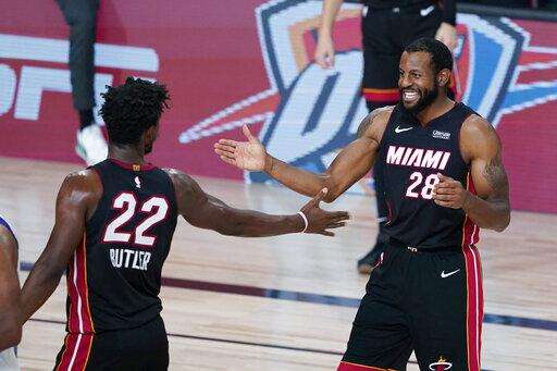 Miami Heat forward Jimmy Butler (22) and guard Andre Iguodala (28) celebrate their win over the Indiana Pacers in an NBA basketball first round playoff game, Saturday, Aug. 22, 2020, in Lake Buena Vista, Fla. (AP Photo/Ashley Landis, Pool) The Associated Press