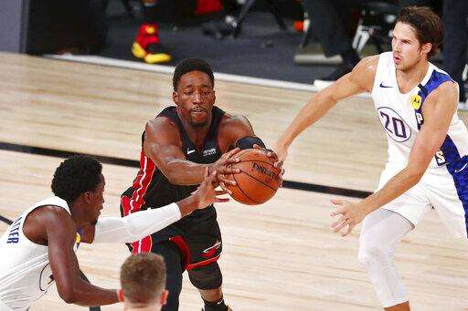 Miami Heat forward Bam Adebayo, top center, Indiana Pacers guard Victor Oladipo, lower left, and forward Doug McDermott, right, go after the ball during the second half of Game 3 of an NBA basketball first-round playoff series, Saturday, Aug. 22, 2020, in Lake Buena Vista, Fla. (Kim Klement/Pool Photo via AP) The Associated Press
