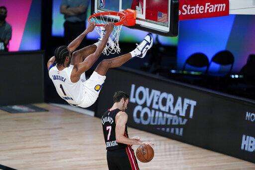 Indiana Pacers forward T.J. Warren (1) hangs on the rim over Miami Heat guard Goran Dragic (7) after he scored during the second half of an NBA basketball first round playoff game, Saturday, Aug. 22, 2020, in Lake Buena Vista, Fla. (AP Photo/Ashley Landis, Pool) The Associated Press