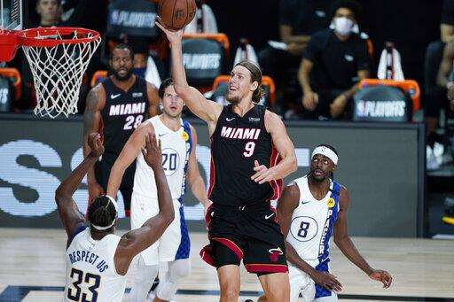 Miami Heat forward Kelly Olynyk (9) shoots over Indiana Pacers center Myles Turner (33) during the second half of an NBA basketball first round playoff game, Saturday, Aug. 22, 2020, in Lake Buena Vista, Fla. (AP Photo/Ashley Landis, Pool) The Associated Press