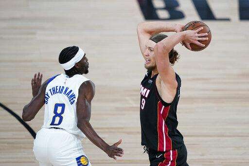 Miami Heat forward Kelly Olynyk (9) looks to pass against Indiana Pacers forward Justin Holiday (8) during the second half of an NBA basketball first round playoff game, Saturday, Aug. 22, 2020, in Lake Buena Vista, Fla. (AP Photo/Ashley Landis, Pool) The Associated Press