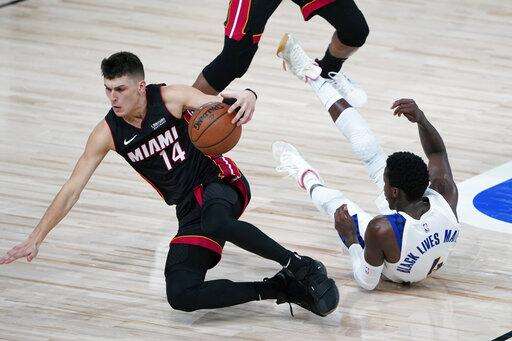 Miami Heat guard Tyler Herro (14) and Indiana Pacers guard Victor Oladipo, right, scramble for a loose ball during the second half of an NBA basketball first round playoff game, Saturday, Aug. 22, 2020, in Lake Buena Vista, Fla. (AP Photo/Ashley Landis, Pool) The Associated Press
