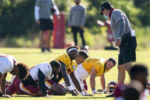 Washington quarterbacks Dwayne Haskins Jr., third from left, Alex Smith, and Kyle Allen, rear, talk with head coach Ron Rivera right, during practice at the team's NFL football training facility, Tuesday, Aug. 18, 2020, in Ashburn, Va. (AP Photo/Alex Brandon) The Associated Press