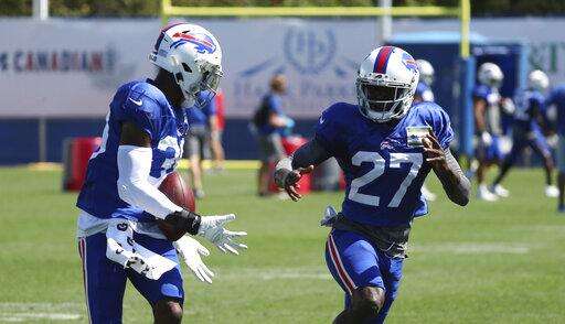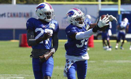 Buffalo Bills cornerback Levi Wallace (39) catches a pass in front of cornerback Tre'Davious White (27) during an NFL football training camp in Orchard Park, N.Y., Monday, Aug. 31, 2020. (James P. McCoy/Buffalo News via AP, Pool) The Associated Press
