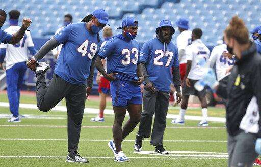 Buffalo Bills safety Siran Neal (33), Buffalo Bills linebacker Tremaine Edmunds (49) and Buffalo Bills cornerback Tre'Davious White (27) stretch during warm ups at practice at Bills Stadium in Orchard Park, N.Y. Wednesday, Sept. 2, 2020. (James P. McCoy /The Buffalo News via AP, Pool) The Associated Press