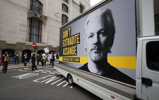 A van with a protest poster passes the Central Criminal Court Old Bailey in London, Monday, Sept. 7, 2020. Lawyers for WikiLeaks founder Julian Assange and the U.S. government were squaring off in a London court on Monday at a high-stakes extradition case delayed by the coronavirus pandemic. American prosecutors have indicted the 49-year-old Australian on 18 espionage and computer misuse charges over Wikileaks' publication of secret U.S. military documents a decade ago. The charges carry a maximum sentence of 175 years in prison. (AP Photo/Frank Augstein)
