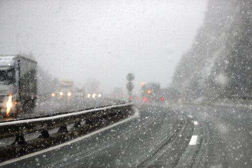 Cars make their way through heavy snow fall on motorway A 13 in Noesslach near Innsbruck, Austria, Friday, Sept. 25, 2020. (AP Photo/Matthias Schrader)