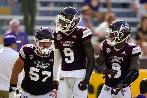Mississippi State won last year's game 54-24, setting SEC-game school records with 460 rushing yards and 640 total. ... Razorbacks sophomore receiver Treylon Burks had career highs of seven catches for 102 yards and his first career TD against Georgia. ... Kylin Hill set a Bulldogs record for receiving yards by running back with 158 on eight catches, including a 75-yard TD. He was among three with at least 100 yards receiving in the game. ... Mississippi State recorded seven sacks at LSU, the most in game since registering seven at Kentucky on Oct. 25, 2014.