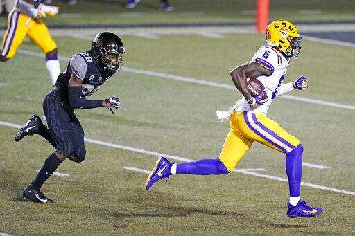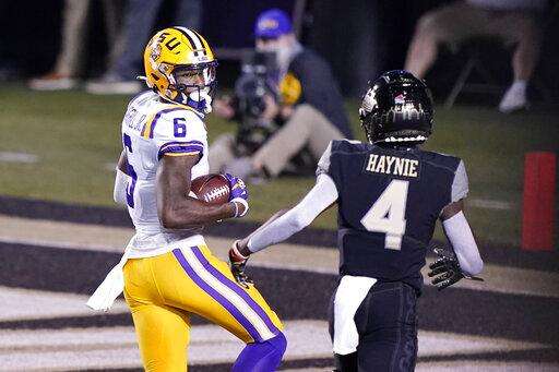 LSU wide receiver Terrace Marshall Jr. (6) looks back at Vanderbilt cornerback Randall Haynie (4) as Marshall scores a touchdown on a 51-yard pass reception in the first half of an NCAA college football game Saturday, Oct. 3, 2020, in Nashville, Tenn. (AP Photo/Mark Humphrey) The Associated Press