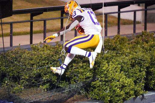LSU wide receiver Jontre Kirklin jumps into a hedge after scoring a touchdown against Vanderbilt in the second half of an NCAA college football game Saturday, Oct. 3, 2020, in Nashville, Tenn. LSU won 41-7. (AP Photo/Mark Humphrey) The Associated Press