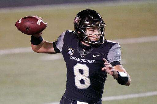 Vanderbilt quarterback Ken Seals passes against LSU in the first half of an NCAA college football game Saturday, Oct. 3, 2020, in Nashville, Tenn. (AP Photo/Mark Humphrey) The Associated Press