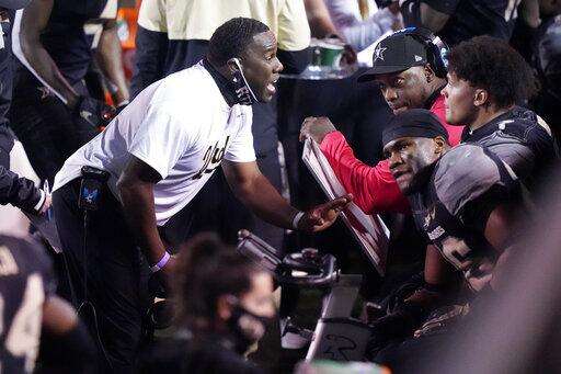 Vanderbilt head coach Derek Mason talks to his players in the second half of an NCAA college football game against LSU Saturday, Oct. 3, 2020, in Nashville, Tenn. LSU won 41-7. (AP Photo/Mark Humphrey) The Associated Press