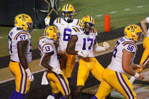 LSU wide receiver Jontre Kirklin (13) and wide receiver Racey McMath (17) celebrate after Kirklin scored a touchdown against Vanderbilt in the first half of an NCAA college football game Saturday, Oct. 3, 2020, in Nashville, Tenn. (AP Photo/Mark Humphrey) The Associated Press