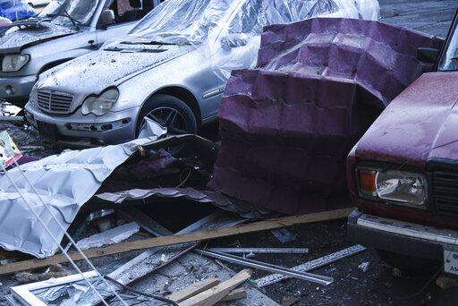 Cars parked at a residential area that were allegedly damaged by shelling are seen during a military conflict in self-proclaimed Republic of Nagorno-Karabakh, Stepanakert, Azerbaijan, Saturday, Oct. 3, 2020. The fighting is the biggest escalation in years in the decades-long dispute over the region, which lies within Azerbaijan but is controlled by local ethnic Armenian forces backed by Armenia. (David Ghahramanyan/NKR InfoCenter PAN Photo via AP)