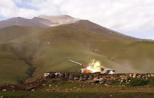 In this handout photo taken from video released by Azerbaijan's Defense Ministry on Saturday, Oct. 3, 2020, an Azerbaijan's army's multiple rocket launcher fires during fighting with forces of the self-proclaimed Republic of Nagorno-Karabakh, Azerbaijan. Armenia and Azerbaijan on Saturday said heavy fighting is continuing in their conflict over the separatist territory of Nagorno-Karabakh. Azerbaijan's president criticized the international mediators who have tried for decades to resolve the dispute. Fighting that started Sept. 27 is the worst to afflict Nagorno-Karabakh and surrounding areas since the 1994 end of a war that left the region in Azerbaijan under the control of ethnic Armenian local forces backed by Armenia. (Azerbaijan's Defense Ministry via AP)
