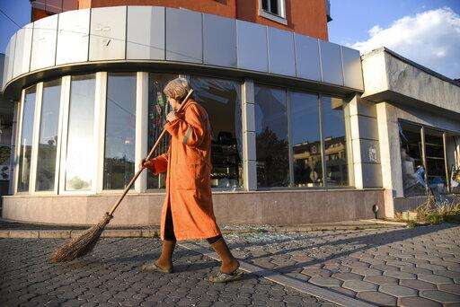 A municipal worker sweeps a street after shelling during a military conflict in self-proclaimed Republic of Nagorno-Karabakh, Stepanakert, Azerbaijan, Saturday, Oct. 3, 2020. The fighting is the biggest escalation in years in the decades-long dispute over the region, which lies within Azerbaijan but is controlled by local ethnic Armenian forces backed by Armenia. (David Ghahramanyan/NKR InfoCenter PAN Photo via AP)