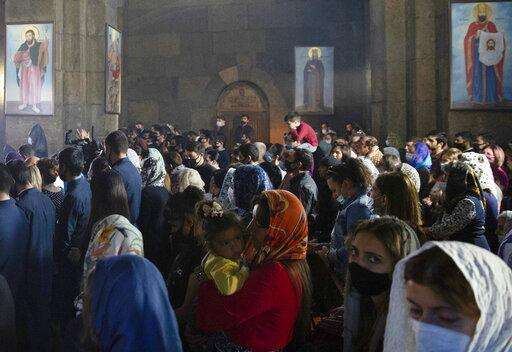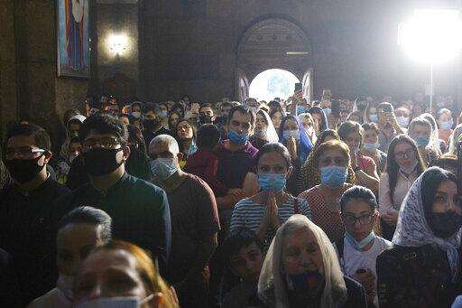 People attend a nationwide prayer for peace lead by Catholicos Karekin II in the Saint Gayane Church in Yerevan, Armenia, Saturday, Oct. 3, 2020. Armenia and Azerbaijan say heavy fighting is continuing in their conflict over the separatist territory of Nagorno-Karabakh and Azerbaijan's president said late Saturday that his troops had taken a village.(Grigor Yepremyan/PAN Photo via AP)