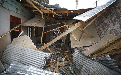 A destroyed house damaged by shelling during fighting over the breakaway region of Nagorno-Karabakh in Terter, Azerbaijan, Saturday, Oct. 3, 2020. Armenia and Azerbaijan say heavy fighting is continuing in their conflict over the separatist territory of Nagorno-Karabakh and Azerbaijan's president said late Saturday his troops had taken a village. (AP Photo/Aziz Karimov)