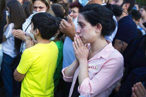 People attend a nationwide prayer for peace lead by Catholicos Karekin II outside the Saint Gayane Church in Yerevan, Armenia, Saturday, Oct. 3, 2020. Armenia and Azerbaijan say heavy fighting is continuing in their conflict over the separatist territory of Nagorno-Karabakh and Azerbaijan's president said late Saturday that his troops had taken a village. (Grigor Yepremyan/PAN Photo via AP)
