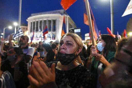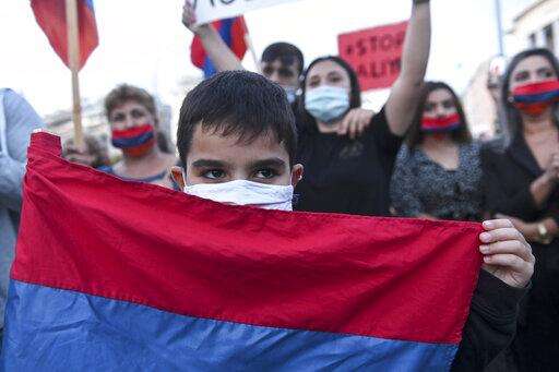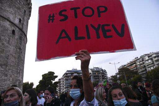 Protesters take part in a demonstration in support of Armenia, in the northern city of Thessaloniki, Greece, Saturday, Oct. 3, 2020. Heavy fighting between Armenia and Azerbaijan continued Saturday in their conflict over the separatist territory of Nagorno-Karabakh, while Azerbaijan's president criticized the international mediators who have tried for decades to resolve the dispute. (AP Photo/Giannis Papanikos)
