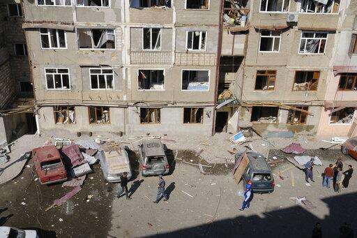 People walk in a residential area that was allegedly damaged by shelling during a military conflict in self-proclaimed Republic of Nagorno-Karabakh, Stepanakert, Azerbaijan, Saturday, Oct. 3, 2020. Armenia and Azerbaijan on Saturday said heavy fighting is continuing in their conflict over the separatist territory of Nagorno-Karabakh. Azerbaijan's president criticized the international mediators who have tried for decades to resolve the dispute. Fighting that started Sept. 27 is the worst to afflict Nagorno-Karabakh and surrounding areas since the 1994 end of a war that left the region in Azerbaijan under the control of ethnic Armenian local forces backed by Armenia. (Aram Kirakosyan/PAN Photo via AP)