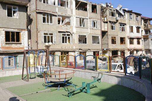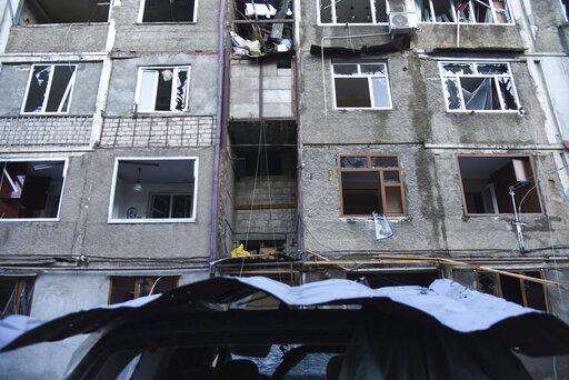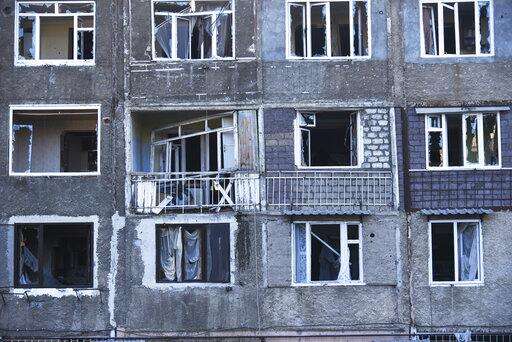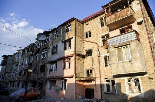 A view of a residential area that was allegedly damaged by shelling during a military conflict in self-proclaimed Republic of Nagorno-Karabakh, Stepanakert, Azerbaijan, Saturday, Oct. 3, 2020. Armenia and Azerbaijan on Saturday said heavy fighting is continuing in their conflict over the separatist territory of Nagorno-Karabakh. Azerbaijan's president criticized the international mediators who have tried for decades to resolve the dispute. Fighting that started Sept. 27 is the worst to afflict Nagorno-Karabakh and surrounding areas since the 1994 end of a war that left the region in Azerbaijan under the control of ethnic Armenian local forces backed by Armenia. (Aram Kirakosyan/PAN Photo via AP)