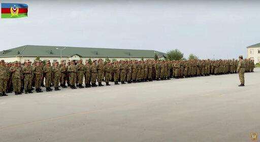 In this handout photo taken from video released by Azerbaijan's Defense Ministry on Saturday, Oct. 3, 2020, Azerbaijan's solders stand in a formation in a military base during fighting with forces of the self-proclaimed Republic of Nagorno-Karabakh, Azerbaijan. Armenia and Azerbaijan on Saturday said heavy fighting is continuing in their conflict over the separatist territory of Nagorno-Karabakh. Azerbaijan's president criticized the international mediators who have tried for decades to resolve the dispute.(Azerbaijan's Defense Ministry via AP)