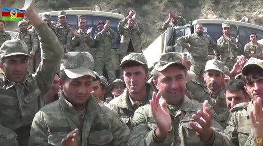 In this grab taken from video released by Azerbaijan's Defense Ministry on Saturday, Oct. 3, 2020, Azerbaijan's solders applaud at a meeting with officers during fighting with forces of the self-proclaimed Republic of Nagorno-Karabakh, Azerbaijan. Armenia and Azerbaijan on Saturday said heavy fighting is continuing in their conflict over the separatist territory of Nagorno-Karabakh. Azerbaijan's president criticized the international mediators who have tried for decades to resolve the dispute. (Azerbaijan's Defense Ministry via AP)