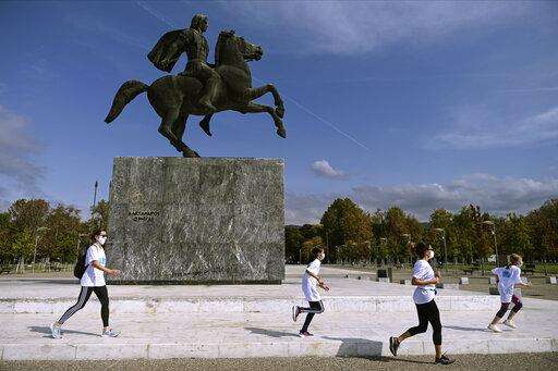 People participate in an event, organized by the local medical association, to support the use of protective masks, in front of a statue of Alexander the Great, in the northern city of Thessaloniki, Greece, Saturday, Oct. 3, 2020. Lung doctors staged a public demonstration of the benefits of face masks by fast-walking a distance of 2 kilometers (1.25 miles) through the city center aiming to debunk a widely-circulated rumor by anti-mask conspiracy theorists that wearing one left people short of breath. (AP Photo/Giannis Papanikos)