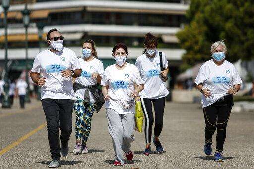 People participate in an event, organized by the local medical association, to support the use of protective masks, in the northern city of Thessaloniki, Greece, Saturday, Oct. 3, 2020. Lung doctors staged a public demonstration of the benefits of face masks by fast-walking a distance of 2 kilometers (1.25 miles) through the city center aiming to debunk a widely-circulated rumor by anti-mask conspiracy theorists that wearing one left people short of breath. (AP Photo/Giannis Papanikos)